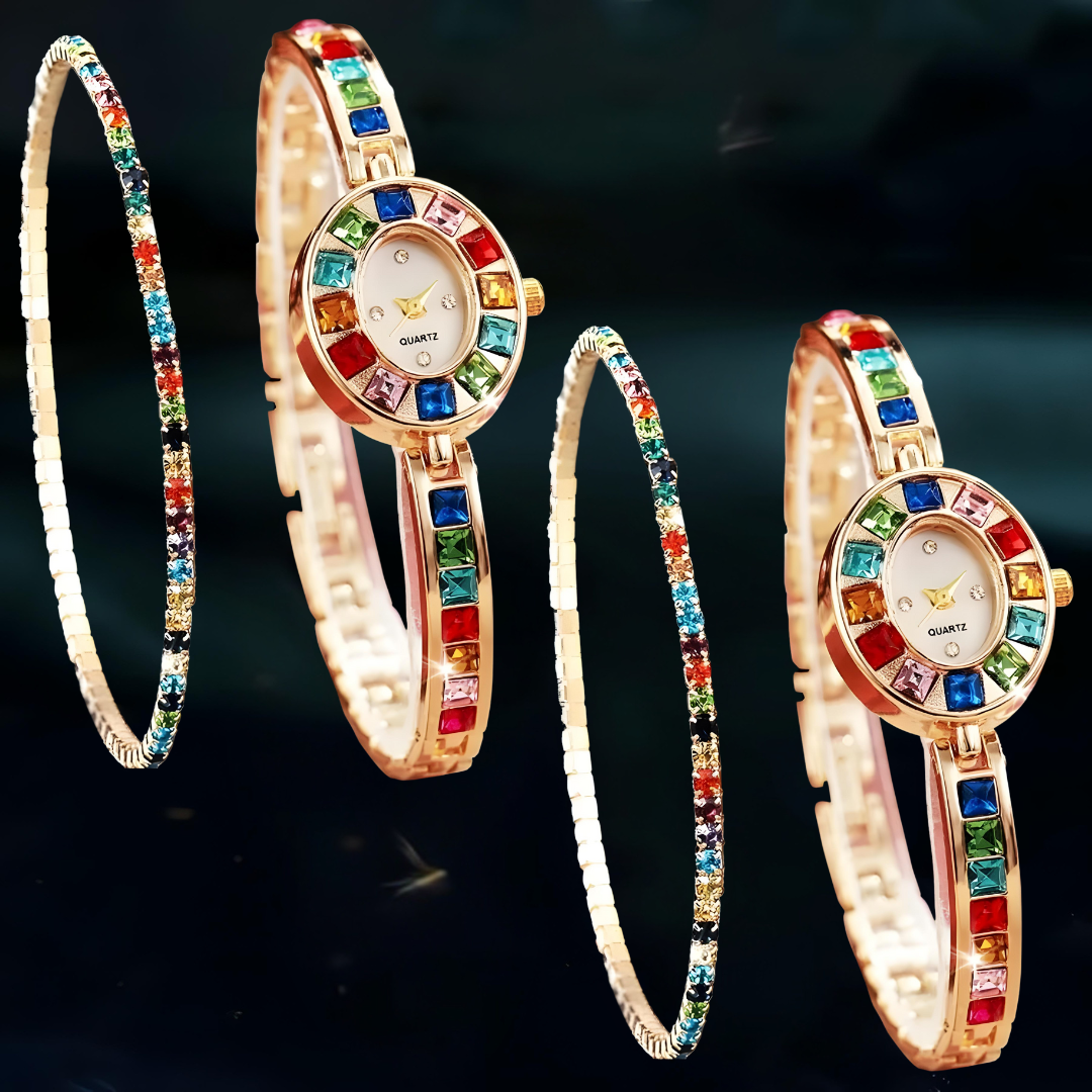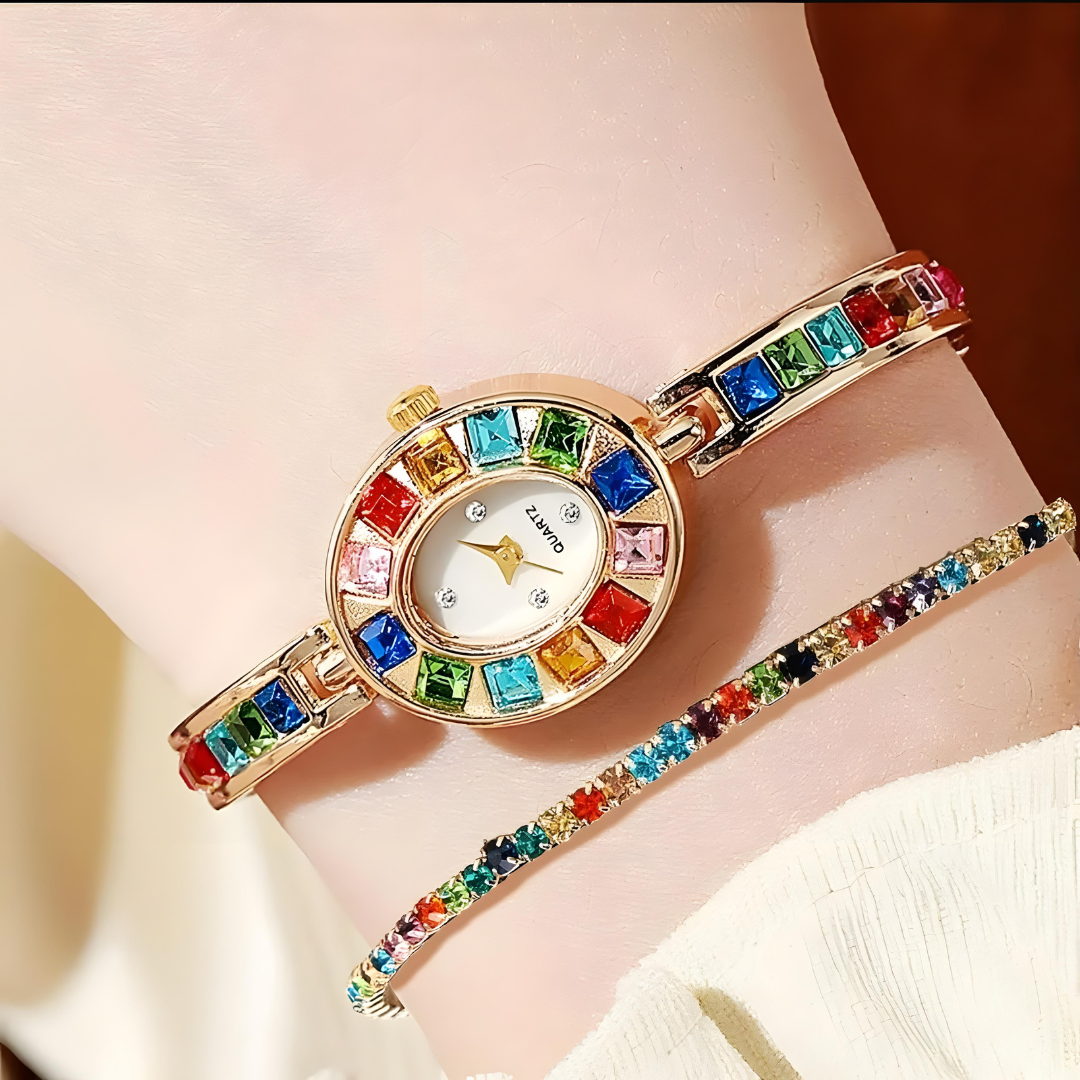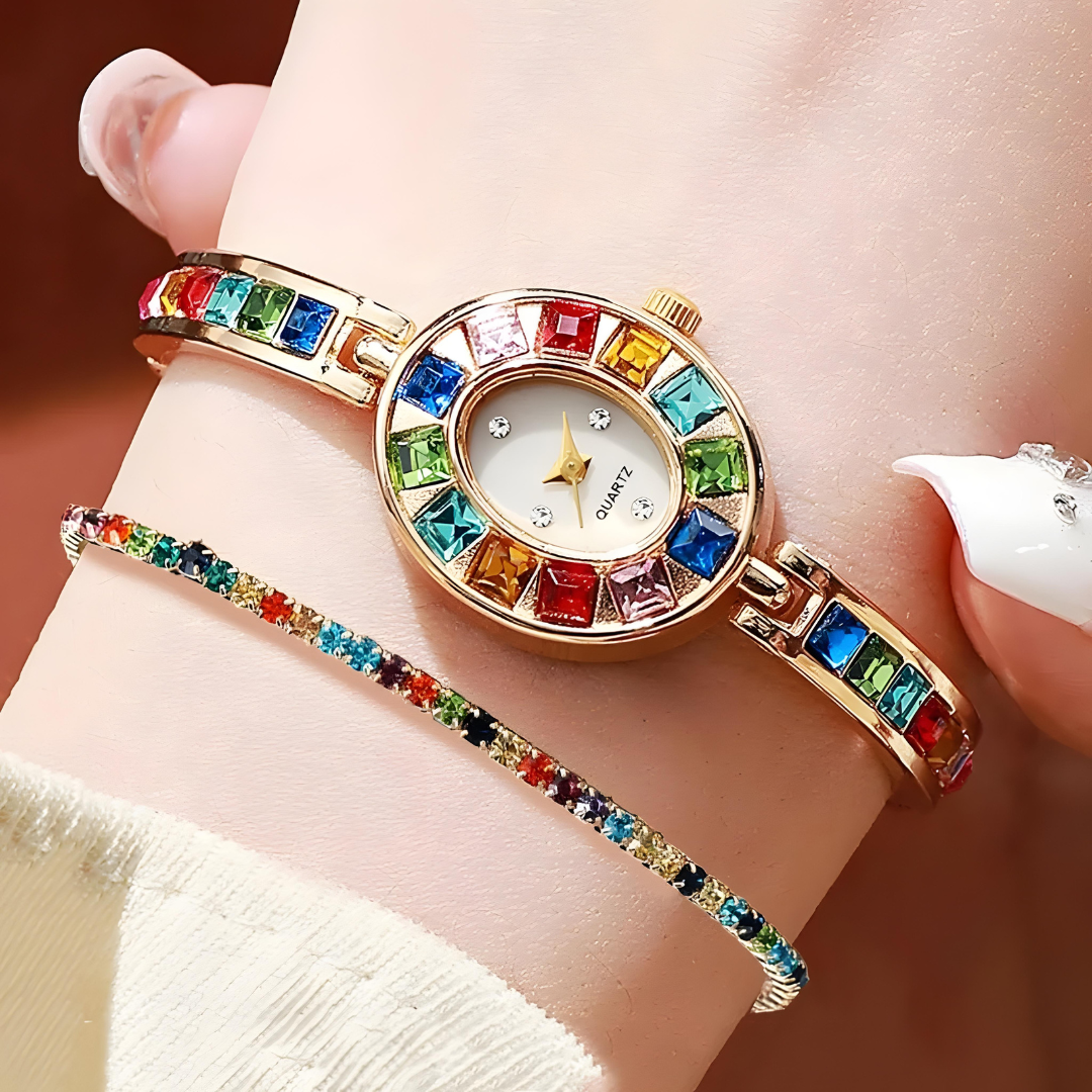 Light up your world with our stunning rainbow crystal design. Each sparkling crystal catches the light in a different beautiful color - red, blue, green, yellow, and more. This magical watch and bracelet set lets you wear every color of happiness on your wrist. The bright crystals dance with light as you move, making you shine wherever you go. Express your colorful spirit and let your true self sparkle.