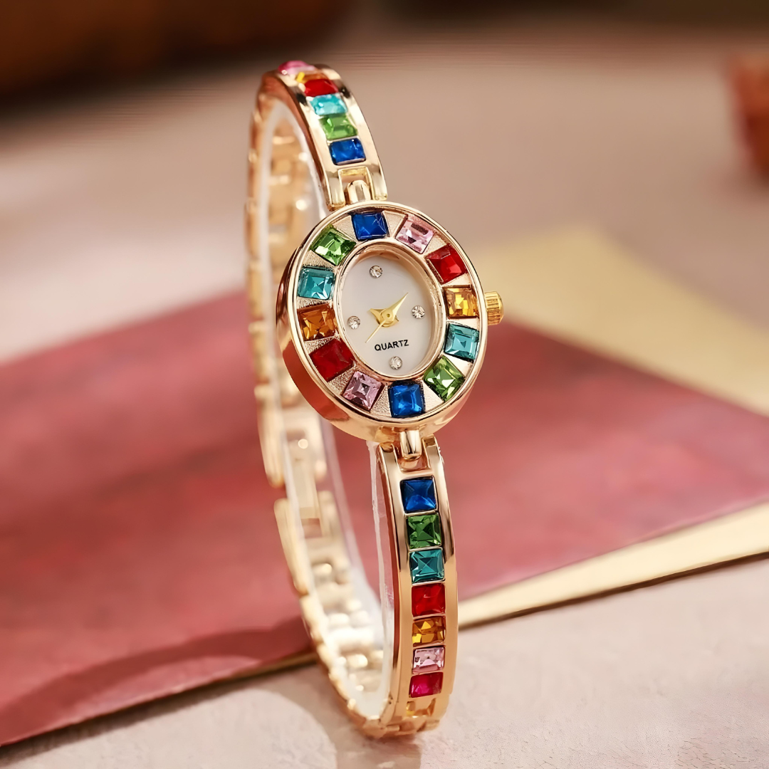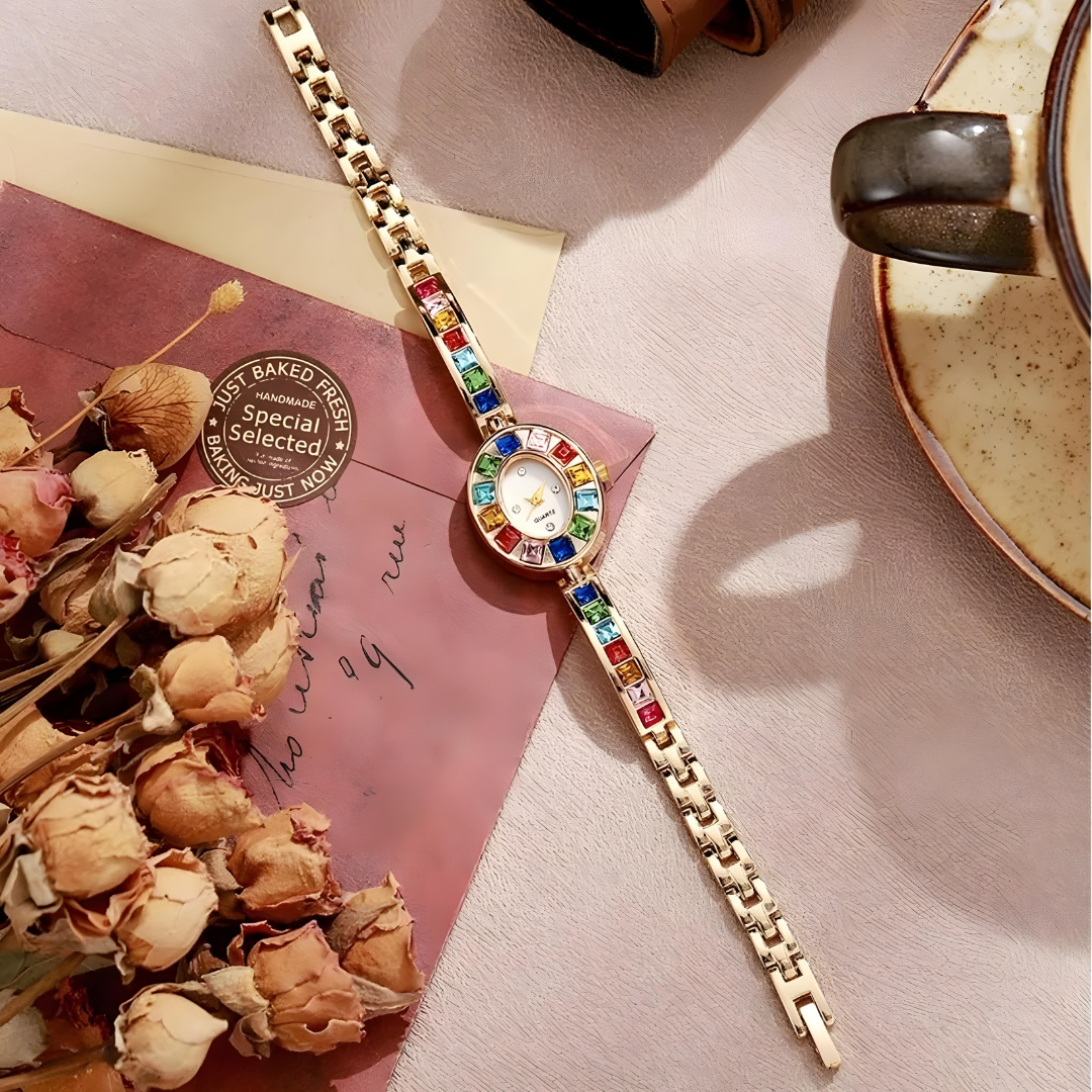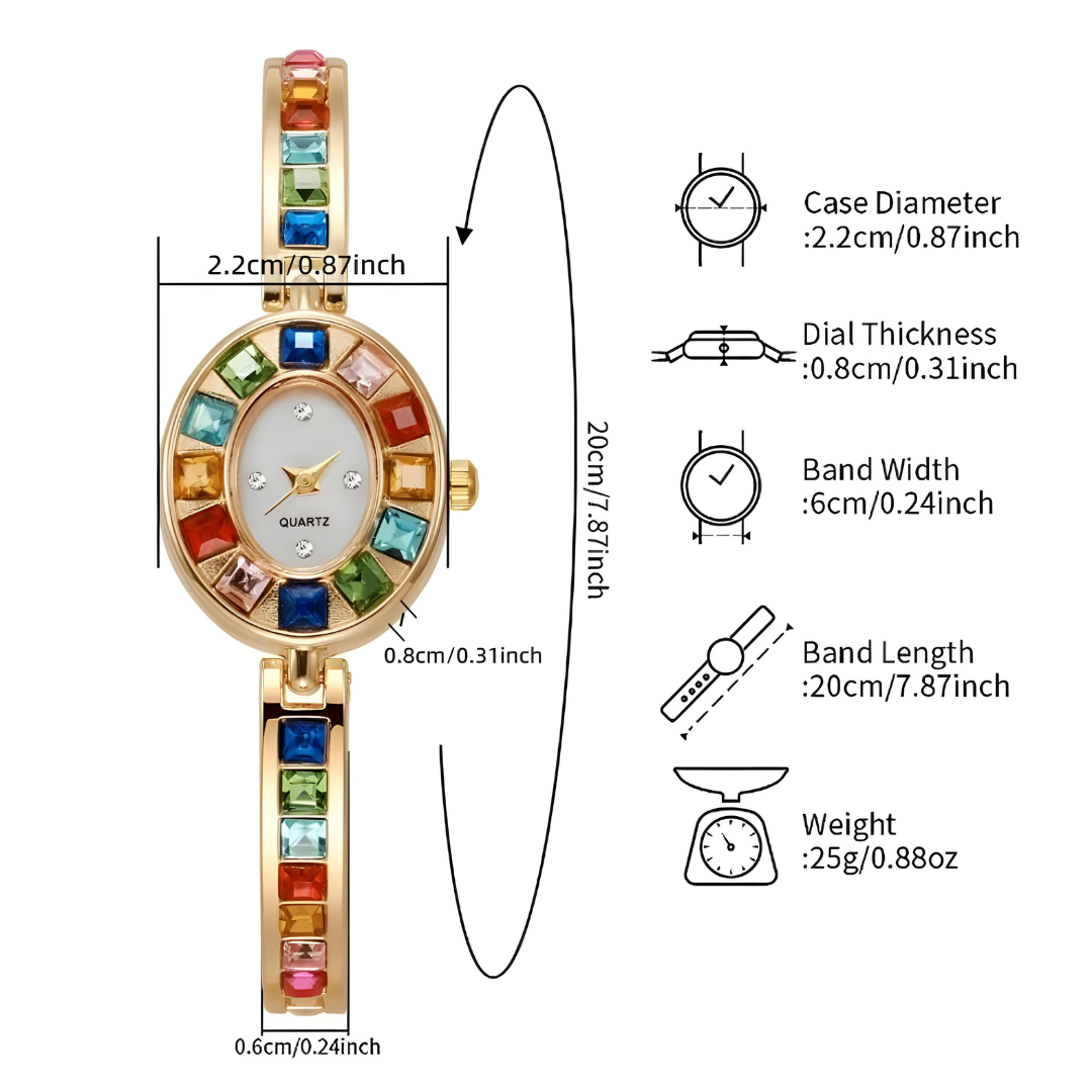 Light up your world with our stunning rainbow crystal design. Each sparkling crystal catches the light in a different beautiful color - red, blue, green, yellow, and more. This magical watch and bracelet set lets you wear every color of happiness on your wrist. The bright crystals dance with light as you move, making you shine wherever you go. Express your colorful spirit and let your true self sparkle.
