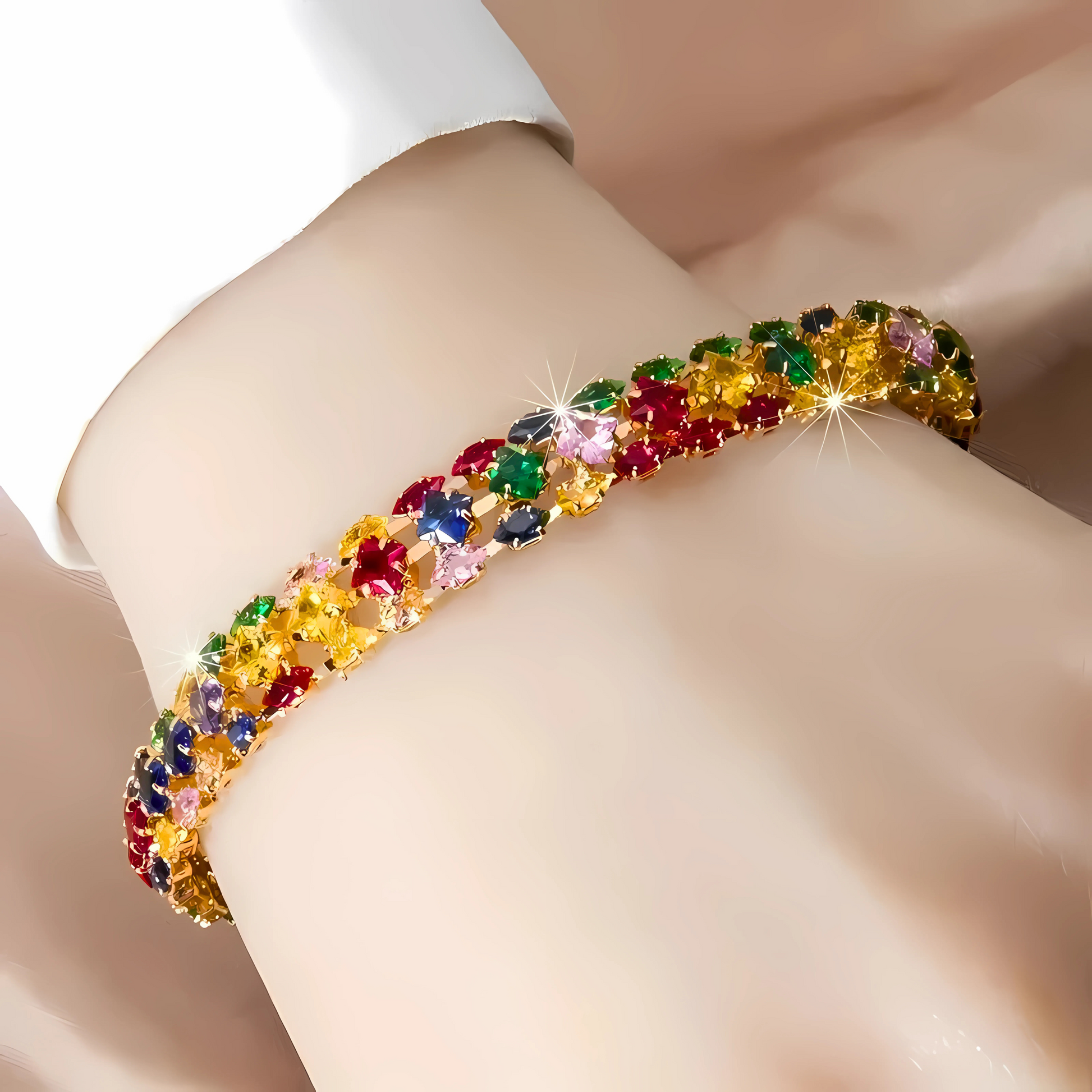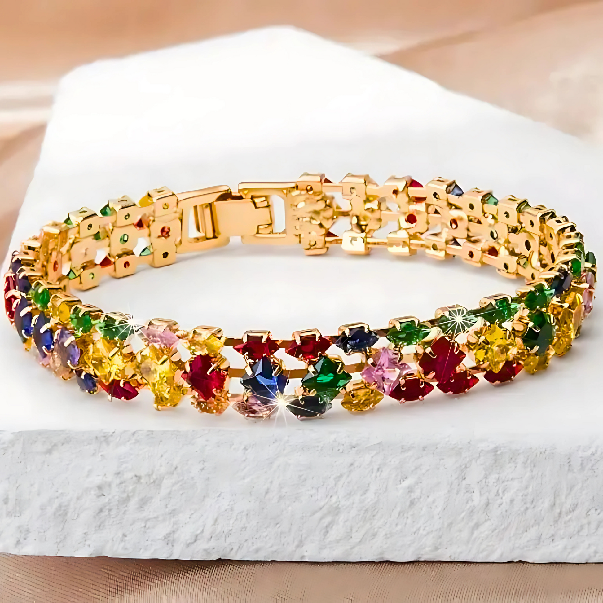 Celebrate life's vibrant moments with our Rainbow Dreams Tennis Bracelet. Hand-selected gemstones in ruby red, emerald green, sapphire blue, and golden citrine dance together in perfect harmony, creating a symphony of color that reflects your unique journey. The luxurious double-row setting creates breathtaking sparkle that catches every light, while the refined craftsmanship and comfortable fit make it perfect for daily wear.